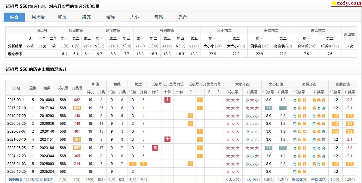 > 283期福彩3D试机号568对应开奖号的组选分析结果